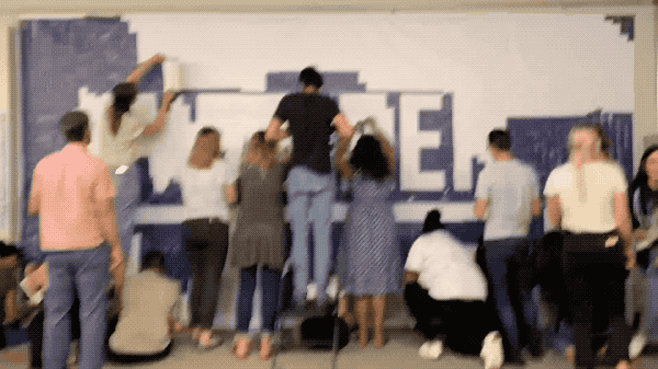 This was a massively successful idea and lots of fun for the staff to construct (below). Each sticker had the name of 6 donors and together we built the logo.